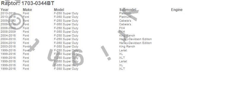 Brand: RaptorPart Number: 1703-0344BTRunning Board Type: 6 in. - Rocker Panel Mount - Black TexturedUPC: 810075531770