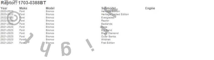 Brand: RaptorPart Number: 1703-0388BTRunning Board Type: 6 in. - Rocker Panel Mount - Black TexturedUPC: 810075531800