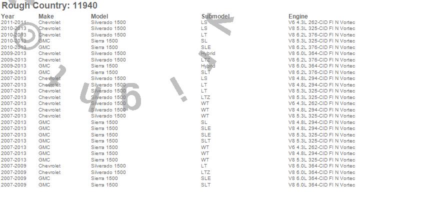 Below is an abbreviated list of applications for the Suspension Lift Kit.Sierra 1500, Silverado 1500, Chevrolet, GMC, 2013, 2012, 2011, 2010, 2009, 2008, 2007