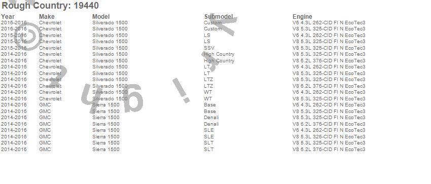 Below is an abbreviated list of applications for the Suspension Lift Kit.Sierra 1500, Silverado 1500, Chevrolet, GMC, 2016, 2015, 2014