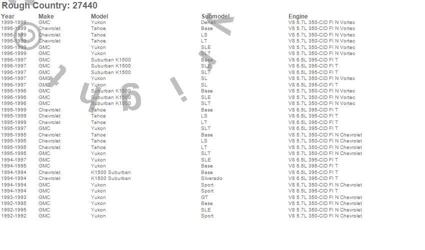 Below is an abbreviated list of applications for the Suspension Lift Kit.K1500 Suburban, Tahoe, Yukon, Chevrolet, GMC, 1999, 1998, 1997, 1996, 1995, 1994, 1993, 1992