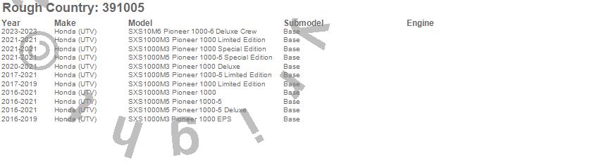 Below is an abbreviated list of applications for the Suspension Lift Kit.SXS1000M3 Pioneer 1000, SXS1000M3 Pioneer 1000 Deluxe, SXS1000M3 Pioneer 1000 EPS, SXS1000M3 Pioneer 1000 Limited Edition, SXS1000M3 Pioneer 1000 Special Edition, SXS1000M5 Pioneer 1000-5, SXS1000M5 Pioneer 1000-5 Deluxe, SXS1000M5 Pioneer 1000-5 Limited Edition, SXS1000M5 Pioneer 1000-5 Special Edition, SXS10M6 Pioneer 1000-6 Deluxe Crew, Honda (UTV), 2023, 2021, 2020, 2019, 2018, 2017, 2016
