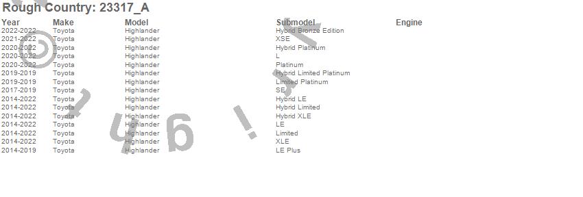 Below is an abbreviated list of applications for the N3 Shocks.Highlander, Toyota, 2022, 2021, 2020, 2019, 2018, 2017, 2016, 2015, 2014