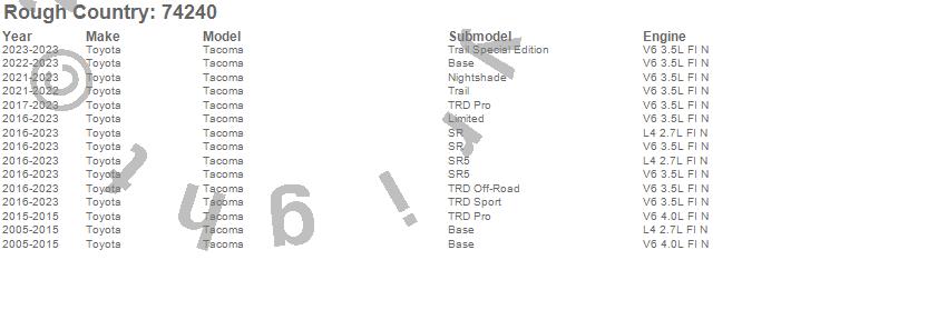 Brand: Rough CountryPart Number: 74240Lift Kit-Suspension w/Shock Type: 3.5 in. Lift - Upper Control Arms - M1 StrutsUPC: 840269910722