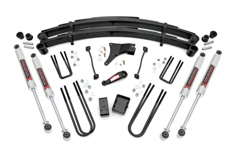 Buy this Suspension Lift Kit w/Shocks Rough Country 49340 6 in. Lift - Rear Block - M1 Series Shock Absorber - Lifted Leaf Spring - Sway-Bar Link - Track Bar Drop Bracket - Pitman Arm - 4 in Lift Block - U-Bolts here at SVCustoms.com an authorized Rough Country Lift Kit-Suspension w/Shock dealer and distributor.