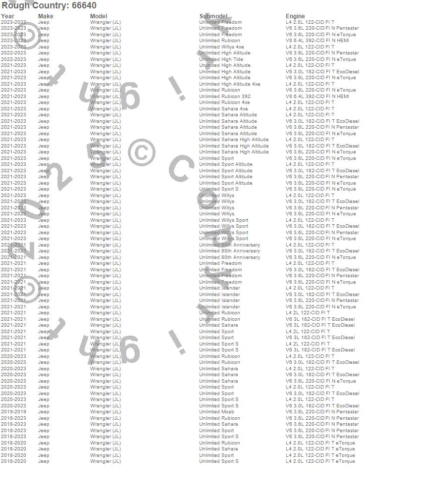 Below is an abbreviated list of applications for the Suspension Lift Kit w/Shocks.Wrangler (JL), Jeep, 2023, 2022, 2021, 2020, 2019, 2018