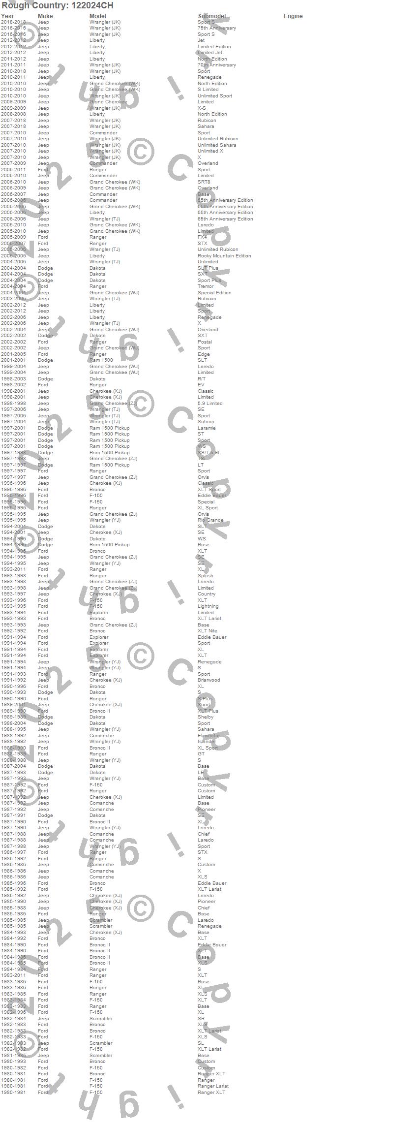 Below is an abbreviated list of applications for the Wheel Installation Kit.Bronco, Bronco II, Cherokee (XJ), Comanche, Commander, Dakota, Explorer, F-150, Grand Cherokee, Grand Cherokee (WJ), Grand Cherokee (WK), Grand Cherokee (ZJ), Liberty, Ram 1500, Ranger, Scrambler, Wrangler (JK), Wrangler (TJ), Wrangler (YJ), Dodge