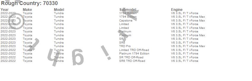 Below is an abbreviated list of applications for the Suspension Lift Kit.Tundra, Toyota, 2023, 2022