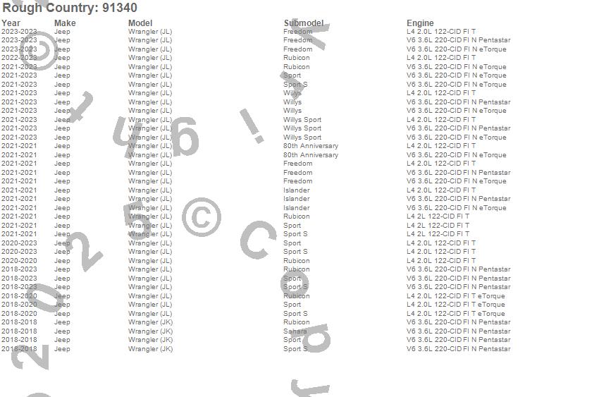 Below is an abbreviated list of applications for the Suspension Lift Kit w/Shocks.Wrangler (JK), Wrangler (JL), Jeep, 2023, 2022, 2021, 2020, 2019, 2018