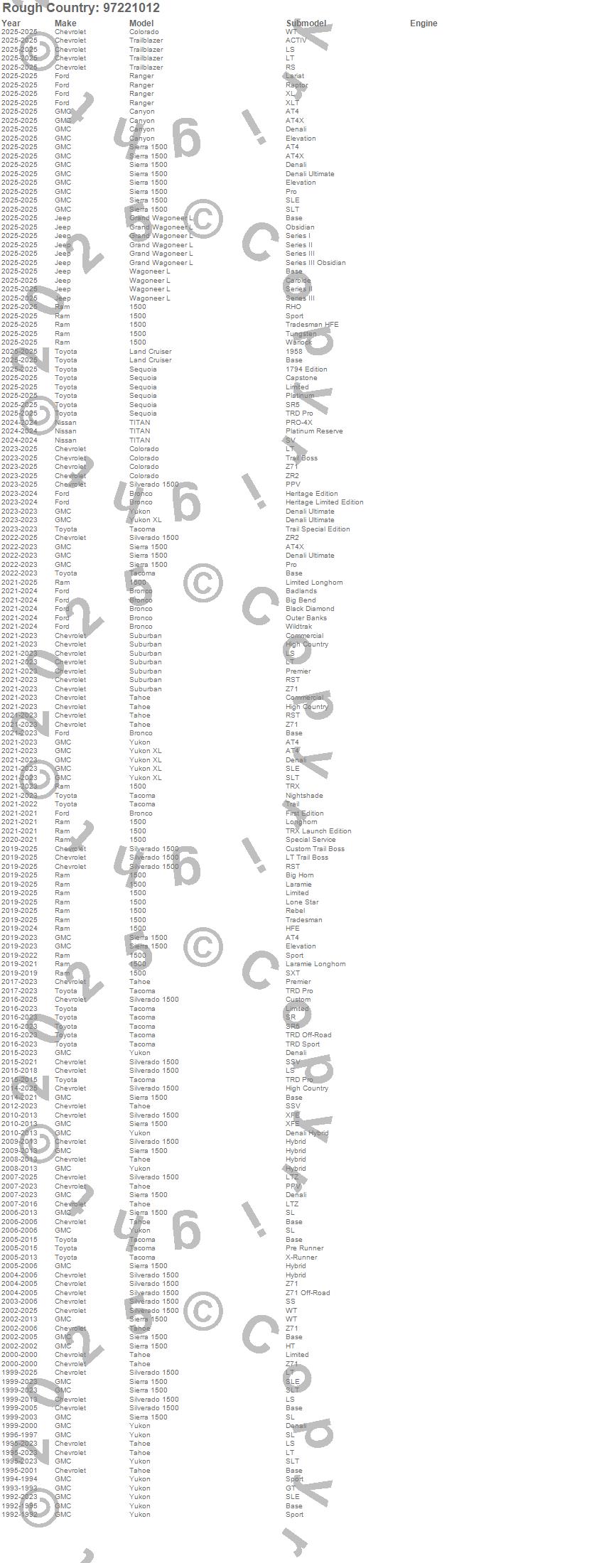 Below is an abbreviated list of applications for the Series 97 Wheel.1500, 4Runner, Bronco, Canyon, Colorado, Escalade, Grand Wagoneer L, Land Cruiser, Ranger, Sequoia, Sierra 1500, Silverado 1500, Suburban, Tacoma, Tahoe, TITAN, Trailblazer, Wagoneer L, Yukon, Yukon XL