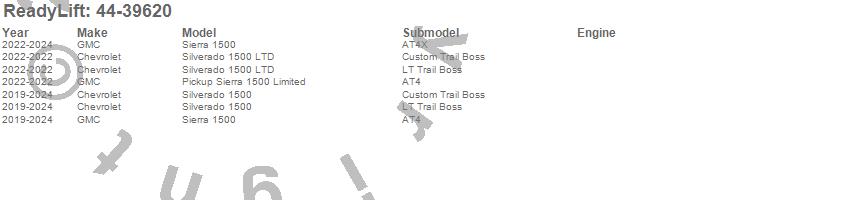 Brand: ReadyLiftPart Number: 44-39620Lift Kit-Suspension Type: 6 in. Lift - [6 in. + 2 in.] For AT4 And Trail BossUPC: 194933302116