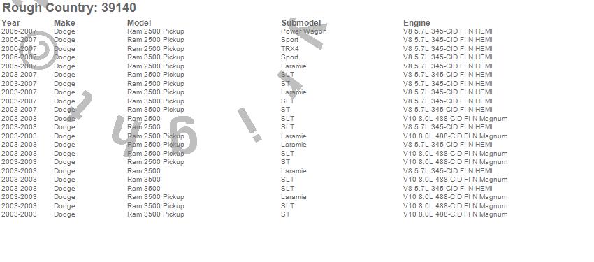Below is an abbreviated list of applications for the Suspension Lift Kit w/Shocks.Ram 2500, Ram 3500, Dodge, 2007, 2006, 2005, 2004, 2003