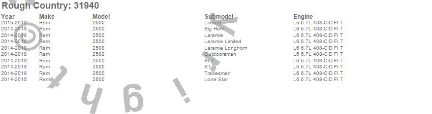 Below is an abbreviated list of applications for the Suspension Lift Kit w/Shocks.2500, Ram, 2018, 2017, 2016, 2015, 2014