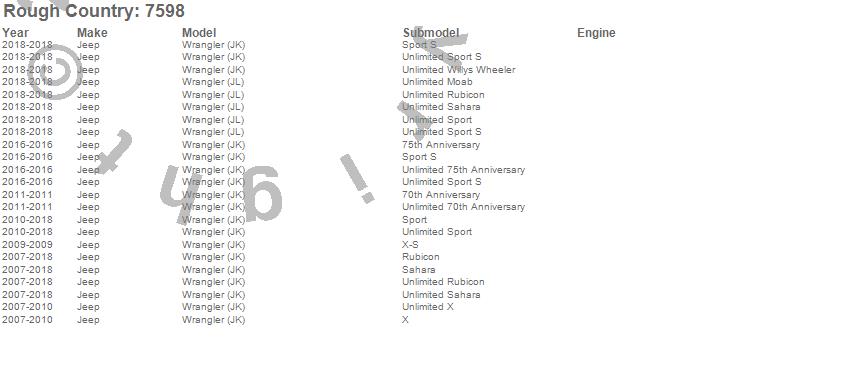 Below is an abbreviated list of applications for the Coil Spring Kit.Wrangler (JK), Wrangler (JL), Jeep, 2018, 2017, 2016, 2015, 2014, 2013, 2012, 2011, 2010, 2009, 2008, 2007