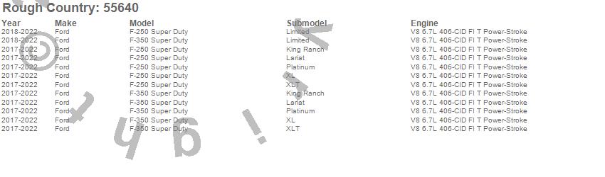 Below is an abbreviated list of applications for the Suspension Lift Kit w/Shocks.F-250 Super Duty, F-350 Super Duty, Ford, 2022, 2021, 2020, 2019, 2018, 2017
