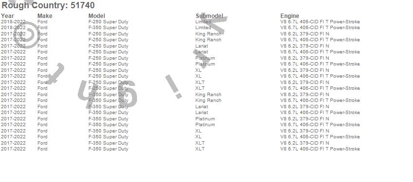Below is an abbreviated list of applications for the Suspension Lift Kit w/Shocks.F-250 Super Duty, F-350 Super Duty, Ford, 2022, 2021, 2020, 2019, 2018, 2017