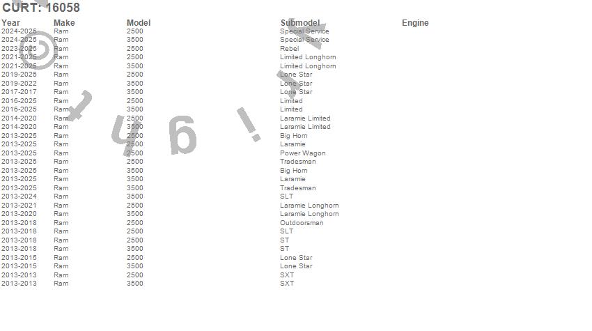 Brand: CURTPart Number: 16058Fifth Wheel Trailer Hitch Type: Sliding - 25000 lbs. Gross Trailer Weight - w/Puck SystemUPC: 612314055487
