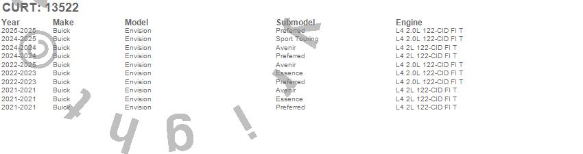 Below is an abbreviated list of applications for the Class III 2 in. Receiver Hitch.Envision, Buick, 2025, 2024, 2023, 2022, 2021