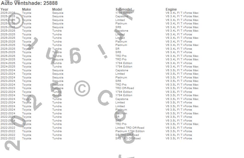 Below is an abbreviated list of applications for the Bugflector II Stone/Bug Deflector.Sequoia, Tundra, Toyota, 2026, 2025, 2024, 2023, 2022