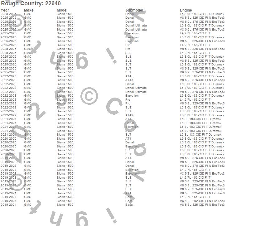 Below is an abbreviated list of applications for the Lift Kit-Suspension w/Shock.Sierra 1500, GMC, 2025, 2023, 2022, 2021, 2020, 2019