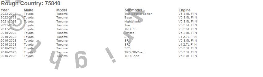 Below is an abbreviated list of applications for the Lift Kit-Suspension w/Shock.Tacoma, Toyota, 2023, 2022, 2021, 2020, 2019, 2018, 2017, 2016