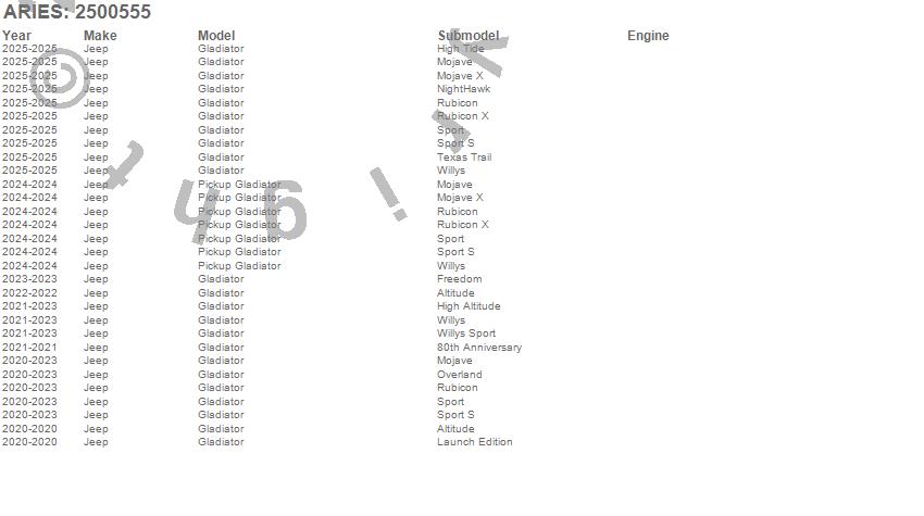 Below is an abbreviated list of applications for the Fender Liner.Gladiator, Pickup Gladiator, Jeep, 2025, 2024, 2023, 2022, 2021, 2020