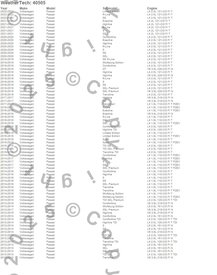 Below is an abbreviated list of applications for the Cargo Liner.Passat, Volkswagen, 2022, 2021, 2020, 2019, 2018, 2017, 2016, 2015, 2014, 2013, 2012