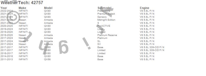 Below is an abbreviated list of applications for the Cargo Liner.Armada, QX56, QX80, INFINITI, Nissan, 2024, 2023, 2022, 2021, 2020, 2019, 2018, 2017, 2016, 2015, 2014, 2013, 2012, 2011
