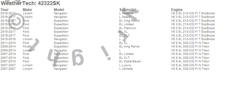 Below is an abbreviated list of applications for the Cargo Liner w/Bumper Protector.Expedition, Navigator, Ford, Lincoln, 2017, 2016, 2015, 2014, 2013, 2012, 2011, 2010, 2009, 2008, 2007