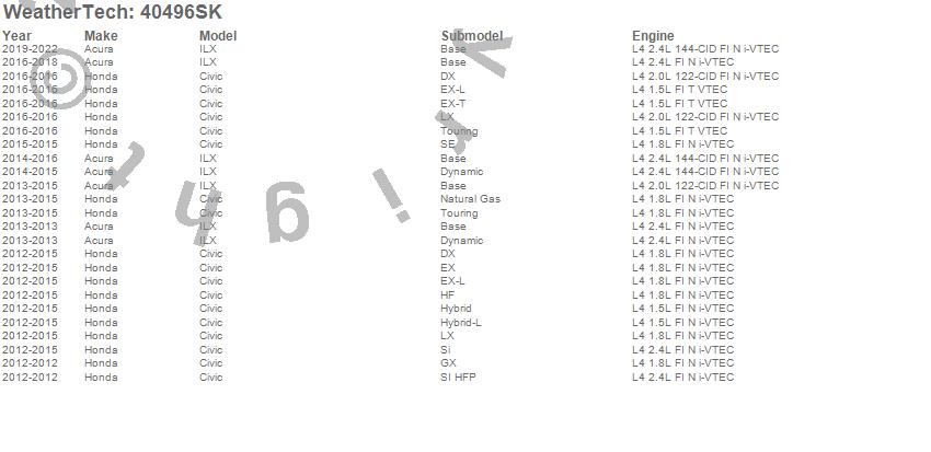 Below is an abbreviated list of applications for the Cargo Liner w/Bumper Protector.Civic, ILX, Acura, Honda, 2022, 2021, 2020, 2019, 2018, 2017, 2016, 2015, 2014, 2013, 2012