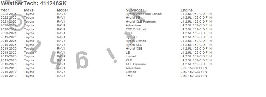Below is an abbreviated list of applications for the Cargo Liner w/Bumper Protector.RAV4, Toyota, 2025, 2024, 2023, 2022, 2021, 2020, 2019
