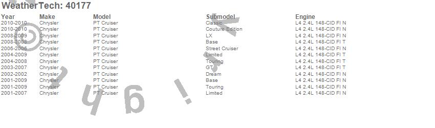 Below is an abbreviated list of applications for the Cargo Liner.PT Cruiser, Chrysler, 2010, 2009, 2008, 2007, 2006, 2005, 2004, 2003, 2002, 2001