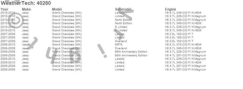 Below is an abbreviated list of applications for the Cargo Liner.Grand Cherokee (WK), Jeep, 2010, 2009, 2008, 2007, 2006, 2005