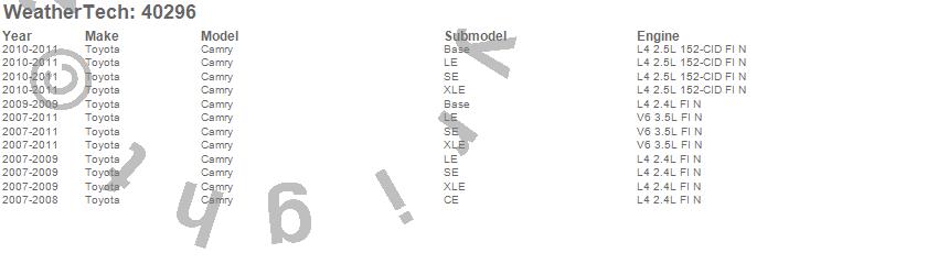 Below is an abbreviated list of applications for the Cargo Liner.Camry, Toyota, 2011, 2010, 2009, 2008, 2007