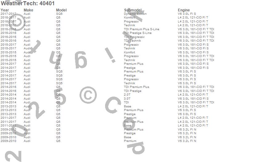 Below is an abbreviated list of applications for the Cargo Liner.Q5, SQ5, Audi, 2017, 2016, 2015, 2014, 2013, 2012, 2011, 2010, 2009