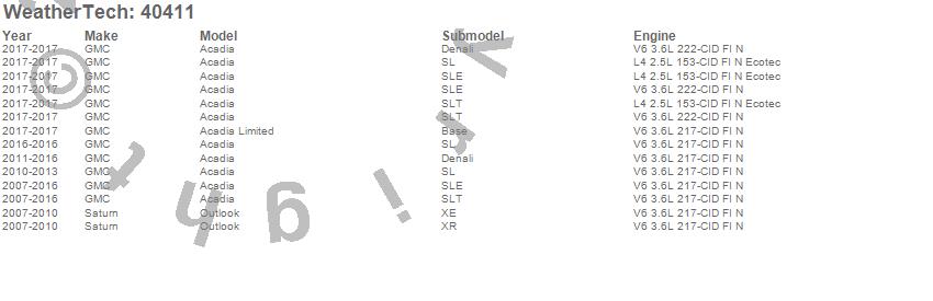 Below is an abbreviated list of applications for the Cargo Liner.Acadia, Acadia Limited, Outlook, GMC, Saturn, 2017, 2016, 2015, 2014, 2013, 2012, 2011, 2010, 2009, 2008, 2007