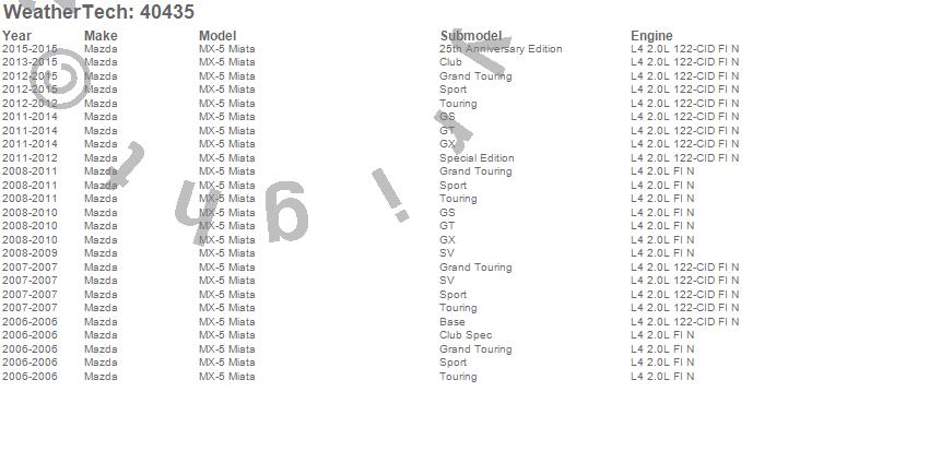 Below is an abbreviated list of applications for the Cargo Liner.MX-5 Miata, Mazda, 2015, 2014, 2013, 2012, 2011, 2010, 2009, 2008, 2007, 2006