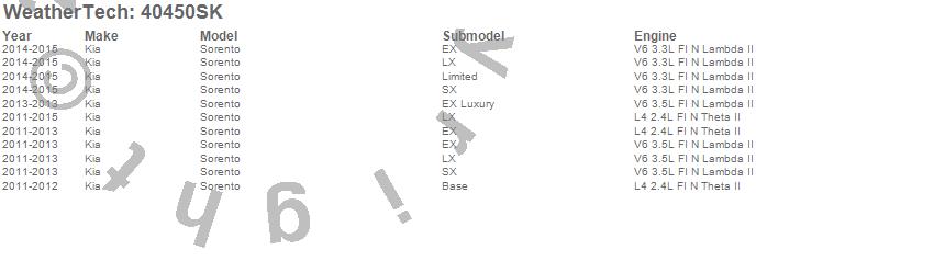 Below is an abbreviated list of applications for the Cargo Liner w/Bumper Protector.Sorento, Kia, 2015, 2014, 2013, 2012, 2011