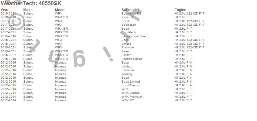Below is an abbreviated list of applications for the Cargo Liner w/Bumper Protector.Impreza, WRX, WRX STI, Subaru, 2021, 2020, 2019, 2018, 2017, 2016, 2015, 2014, 2013, 2012