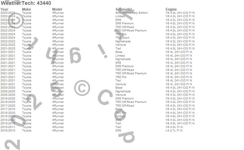 Below is an abbreviated list of applications for the Cargo Liner.4Runner, Toyota, 2024, 2023, 2022, 2021, 2020, 2019, 2018, 2017, 2016, 2015, 2014, 2013, 2012, 2011, 2010
