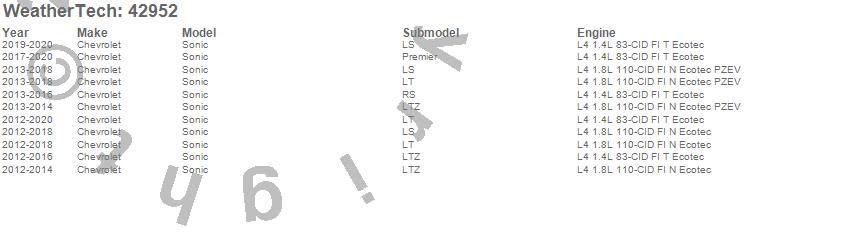 Below is an abbreviated list of applications for the Cargo Liner.Sonic, Chevrolet, 2020, 2019, 2018, 2017, 2016, 2015, 2014, 2013, 2012
