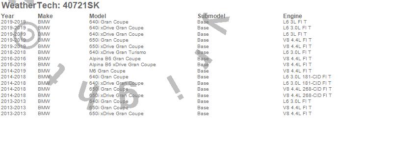 Below is an abbreviated list of applications for the Cargo Liner w/Bumper Protector.640i Gran Coupe, 640i xDrive Gran Coupe, 640i xDrive Gran Turismo, 650i Gran Coupe, 650i xDrive Gran Coupe, Alpina B6 Gran Coupe, Alpina B6 xDrive Gran Coupe, M6 Gran Coupe, BMW, 2019, 2018, 2017, 2016, 2015, 2014, 2013