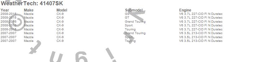 Below is an abbreviated list of applications for the Cargo Liner w/Bumper Protector.CX-9, Mazda, 2015, 2014, 2013, 2012, 2011, 2010, 2009, 2008, 2007