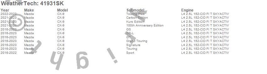 Below is an abbreviated list of applications for the Cargo Liner w/Bumper Protector.CX-9, Mazda, 2023, 2022, 2021, 2020, 2019, 2018, 2017, 2016