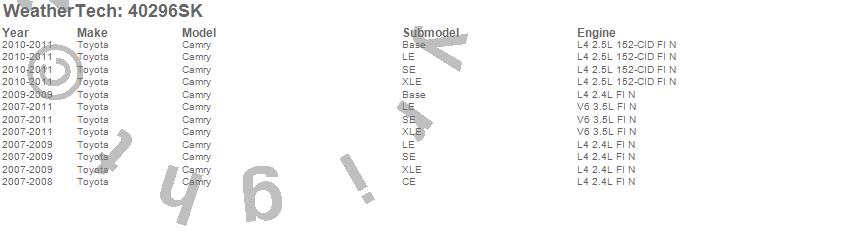 Below is an abbreviated list of applications for the Cargo Liner w/Bumper Protector.Camry, Toyota, 2011, 2010, 2009, 2008, 2007
