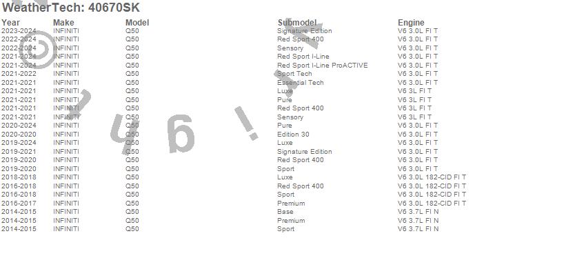 Below is an abbreviated list of applications for the Cargo Liner w/Bumper Protector.Q50, INFINITI, 2024, 2023, 2022, 2021, 2020, 2019, 2018, 2017, 2016, 2015, 2014