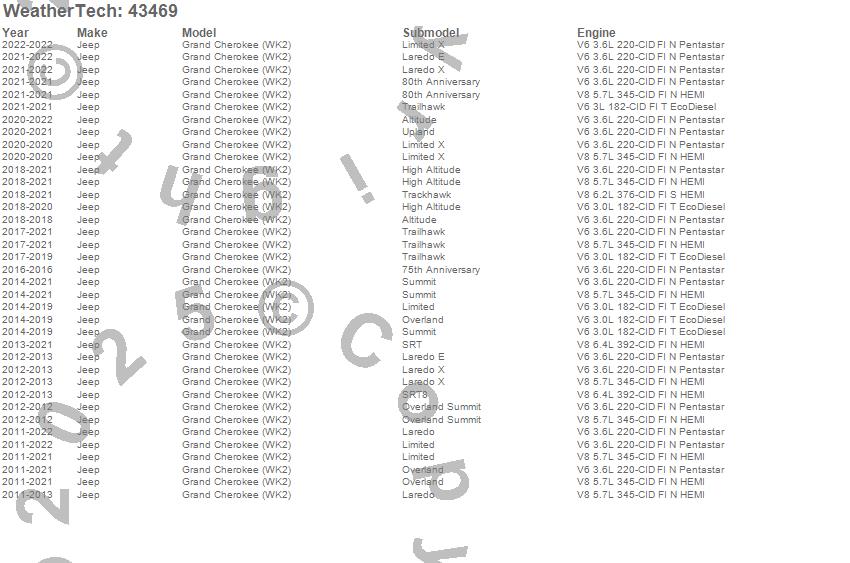 Below is an abbreviated list of applications for the Cargo Liner.Grand Cherokee (WK2), Jeep, 2022, 2021, 2020, 2019, 2018, 2017, 2016, 2015, 2014, 2013, 2012, 2011