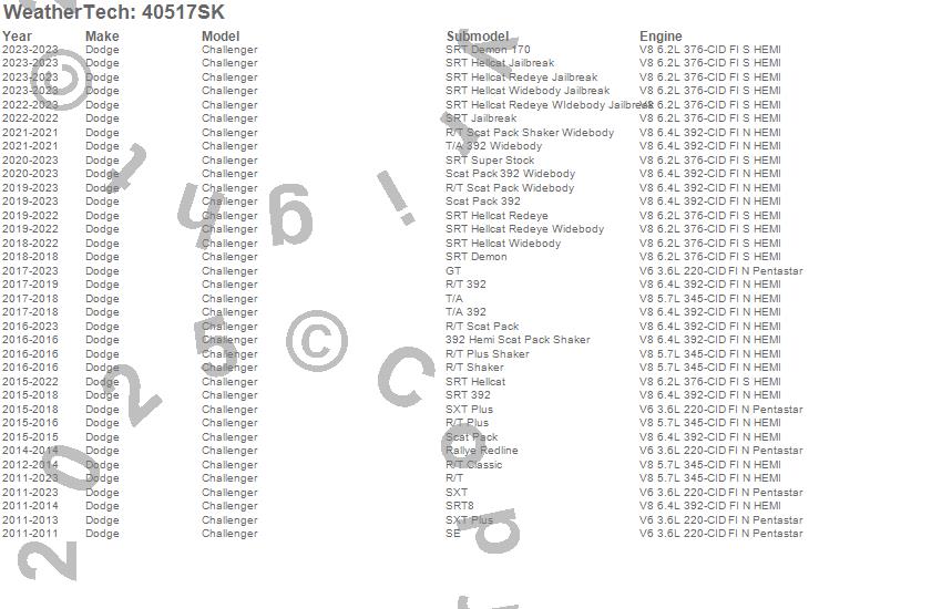 Below is an abbreviated list of applications for the Cargo Liner w/Bumper Protector.Challenger, Dodge, 2023, 2022, 2021, 2020, 2019, 2018, 2017, 2016, 2015, 2014, 2013, 2012, 2011