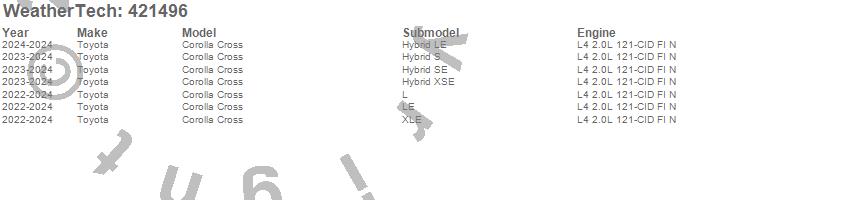 Below is an abbreviated list of applications for the Cargo Liner.Corolla Cross, Toyota, 2026, 2025, 2024, 2023, 2022