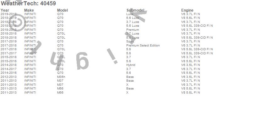 Below is an abbreviated list of applications for the Cargo Liner.M35h, M37, M56, Q70, Q70L, INFINITI, 2019, 2018, 2017, 2016, 2015, 2014, 2013, 2012, 2011